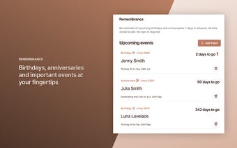 Remembrance เป็นส่วนขยาย Chrome ฟรีที่ออกแบบมาเพื่อช่วยให้ผู้ใช้ติดตามเหตุการณ์สำคัญ เช่น วันเกิดและวันครบรอบ เครื่องมือนี้ให้การเตือนล่วงหน้า 7 วัน เพื่อให้ผู้ใช้ไม่พลาดโอกาสสำคัญอีกต่อไป ส่วนขยายนี้เก็บข้อมูลทั้งหมดไว้ในเครื่อง ทำให้ไม่จำเป็นต้องมีขั้นตอนการเข้าสู่ระบบ ซึ่งช่วยเพิ่มความเป็นส่วนตัวและความสะดวกสบายให้กับผู้ใช้